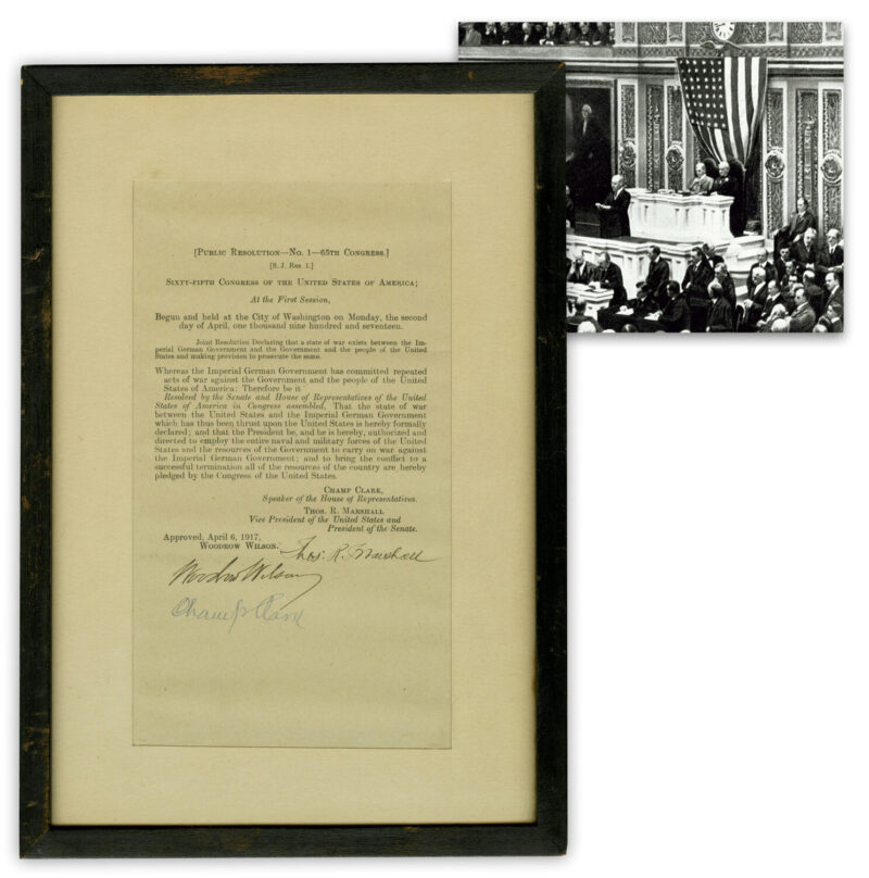 Lot 135 is a printed copy of Public Resolution No. 1 of the 65th Congress, dated April 6, 1917, signed by President Woodrow Wilson, VP Thomas Marshall, and House Speaker Champ Clarke, declaring war on Germany. Wilson had urged Congress to declare war in the face of unrestricted
